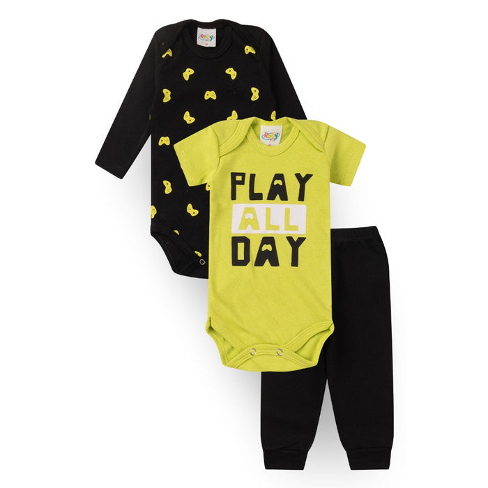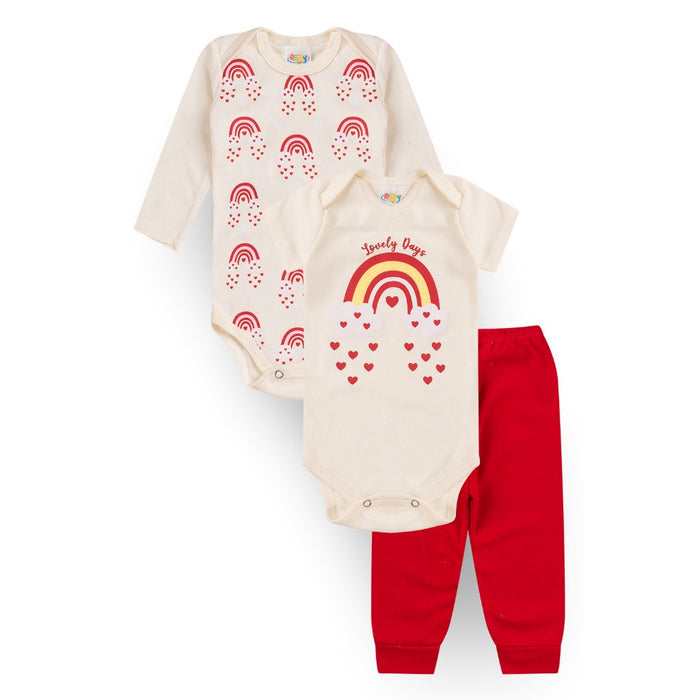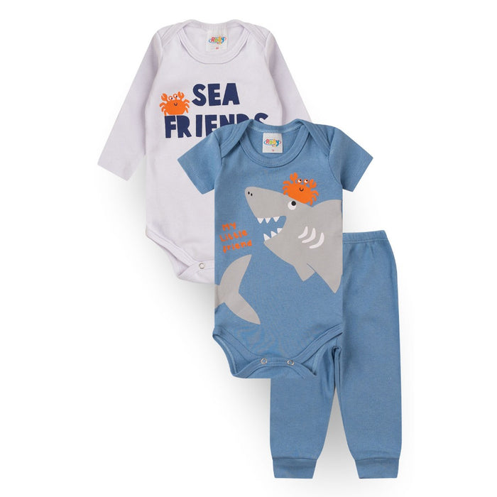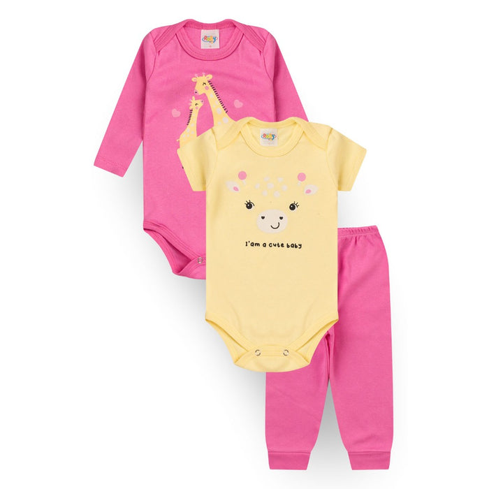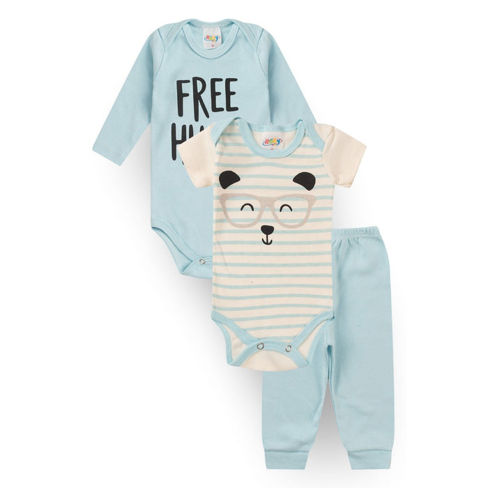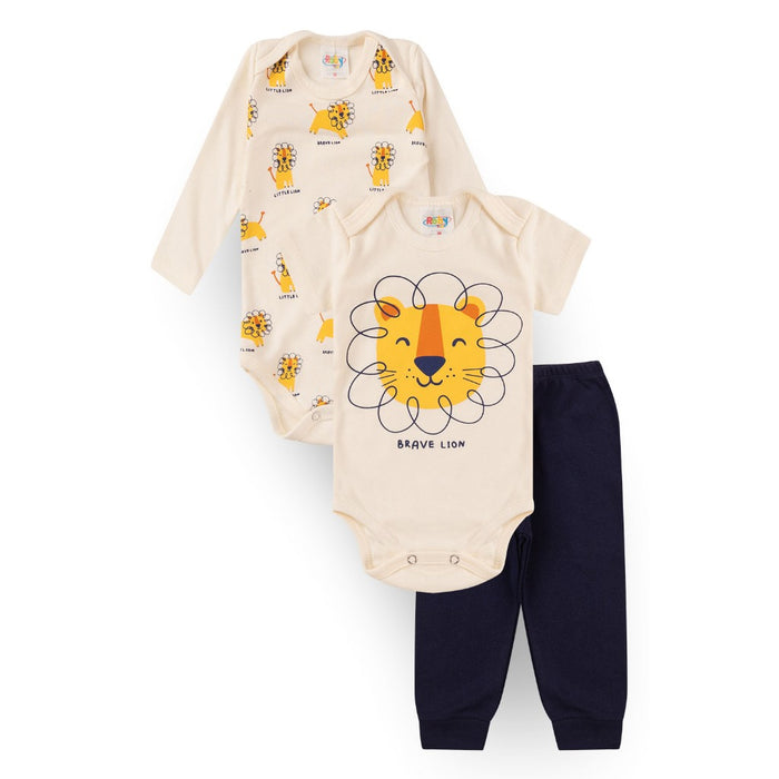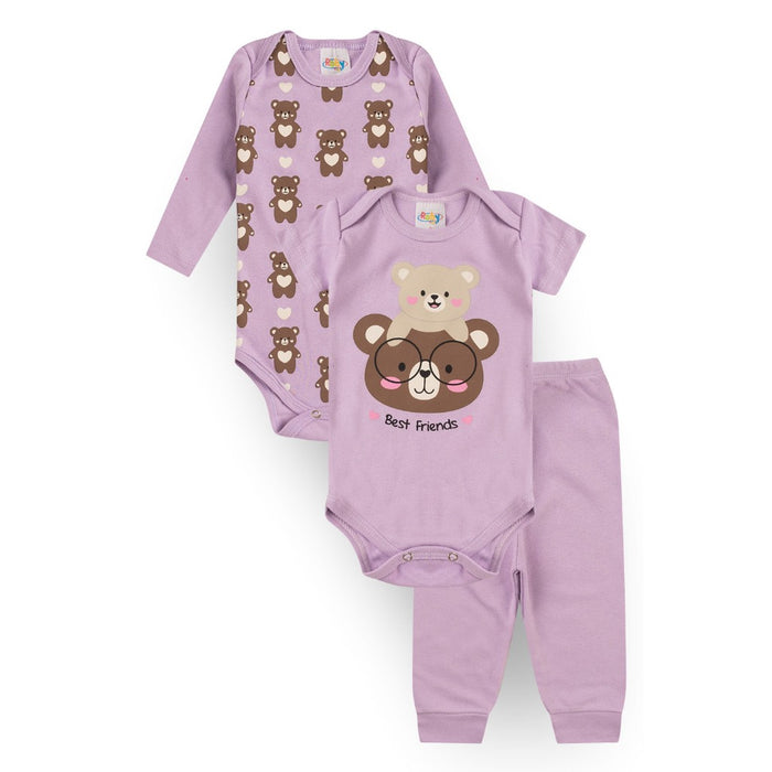 Cada kit é composto por 1 body manga longa, 1 body manga curta, confeccionados em Suedine 100% Algodão, ombros transpassados e cava americana, estampa em silk, abotoamento entrepernas; 1 Calça confeccionada em Suedine 100% Algodão com elástico na cintura e punho 4 cm.